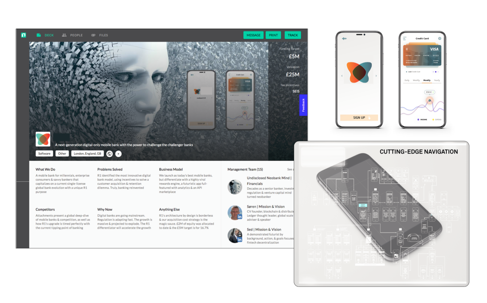 Itérations 1 et 2 d’un projet d’application mobile en FinTech, basé en Angleterre et en Suisse. Utilise des technologies avancées dont le blockchain et l’intelligence artificielle. En cours de création: architecture et stratégie de marque, identité visuelle, design d’app. (UX/UI), stratégie marketing de lancement (gamification).